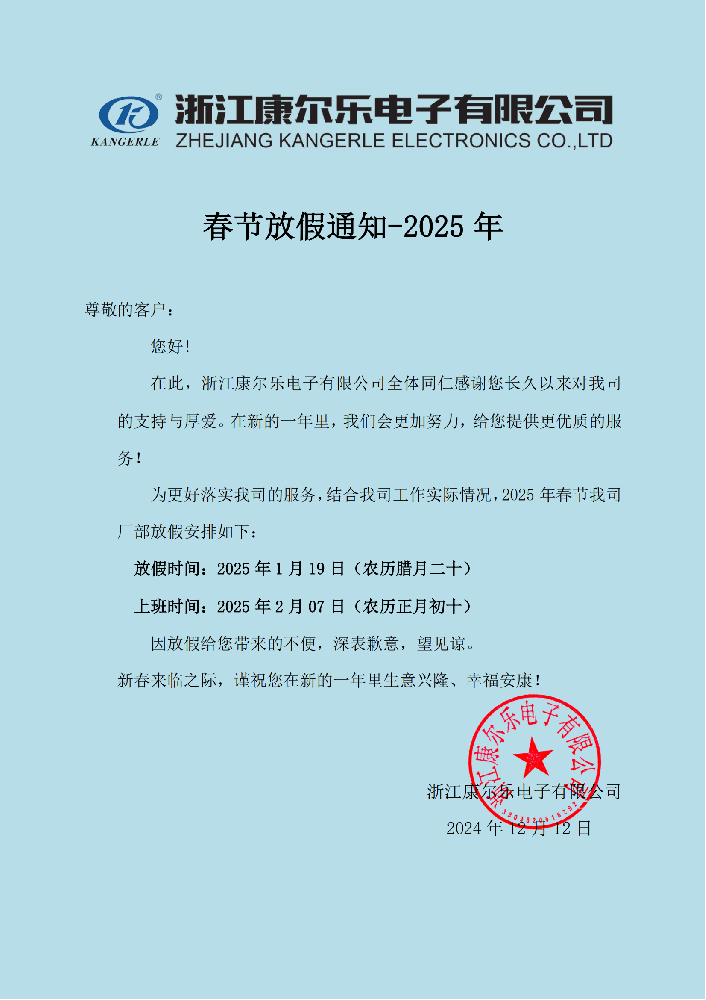 尊敬的客戶:您好!在此,浙江康爾樂電子有限公司全體同仁感謝您長久以來對我司的支持與厚愛。在新的一年里,···